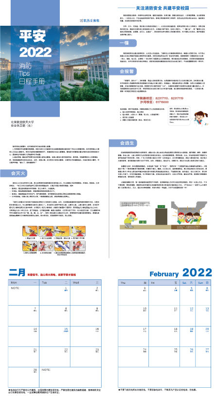 活动现场还发放了《平安2022 消防Tips日程手册》 ,手册内容包括消防安全“一懂三会”、每月消防提示、消防安全基础知识、学校应急电话、学校安全教育体验馆简介与预约等内容,与2022年度日历日程相结合,希望通过动态化、伴随化的方式,科普消防知识,提高师生消防安全意识和能力。